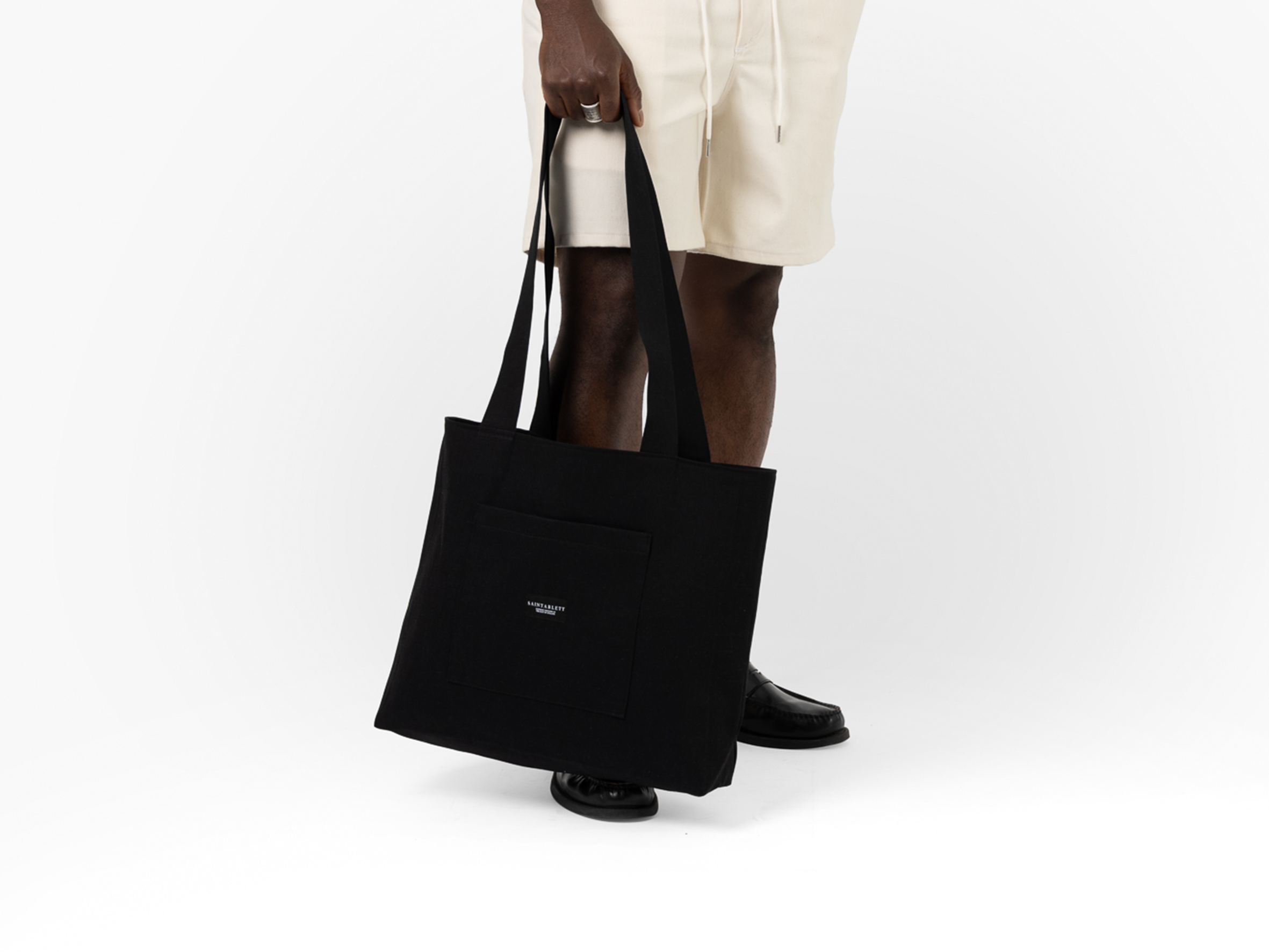 Introducing TOTE 001 in Black Japanese Denim. Conceived as a solution to the panel of wasted fabric created when cutting from a wider than average fabric roll, the tote bag is made entirely by hand in Norwich. Featuring an internal lining, internal and external pocket, extra long handles and SAINTABLETT branding.