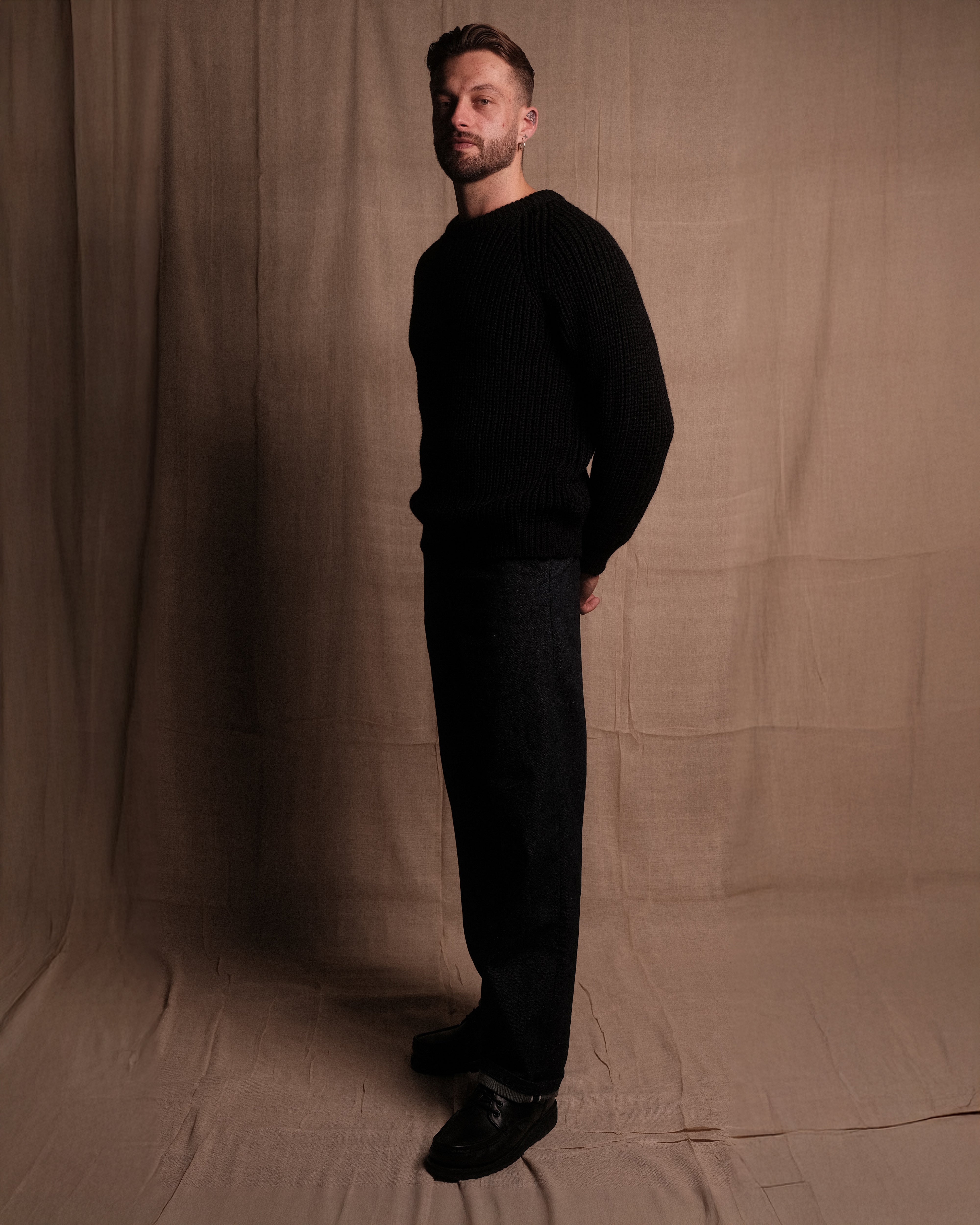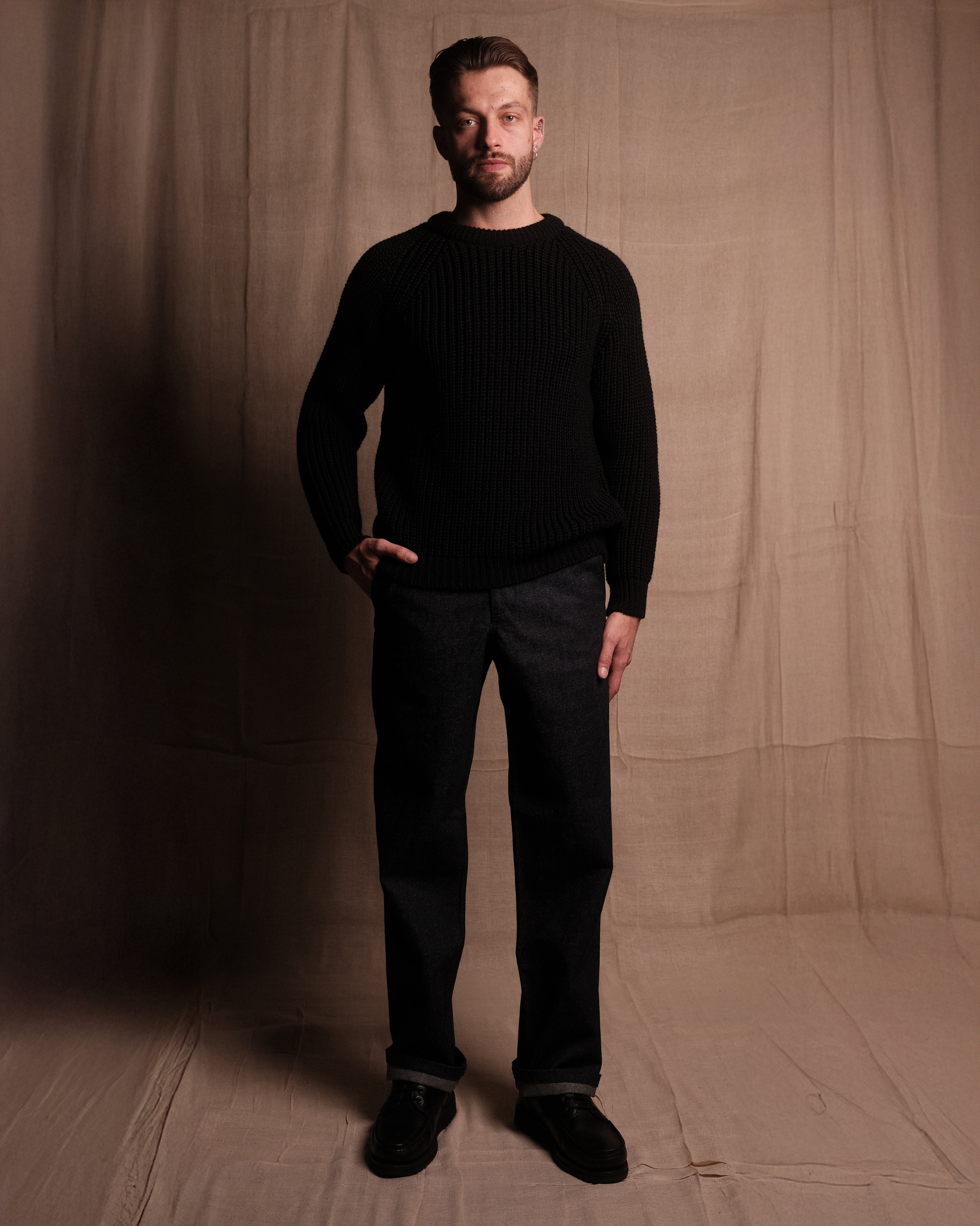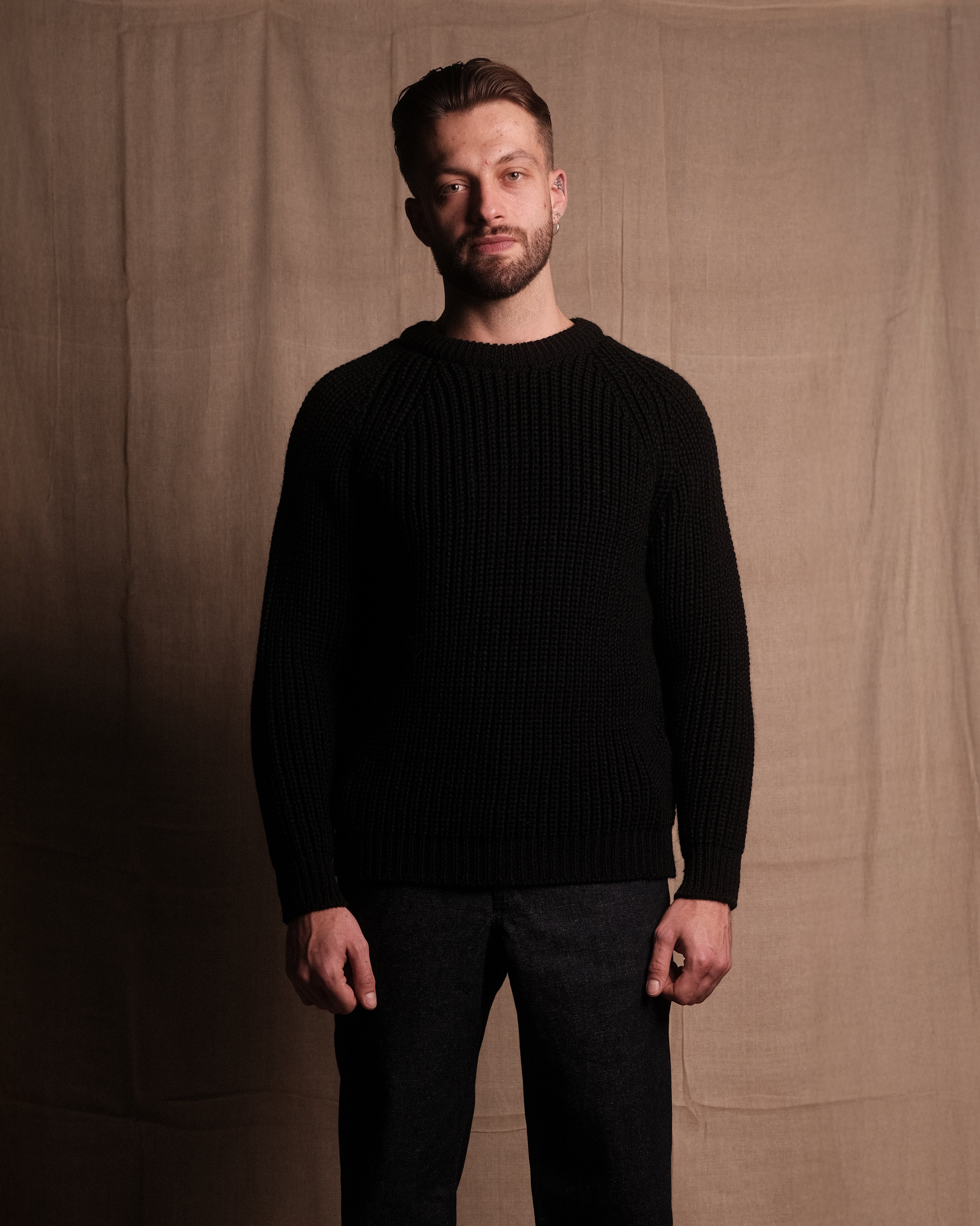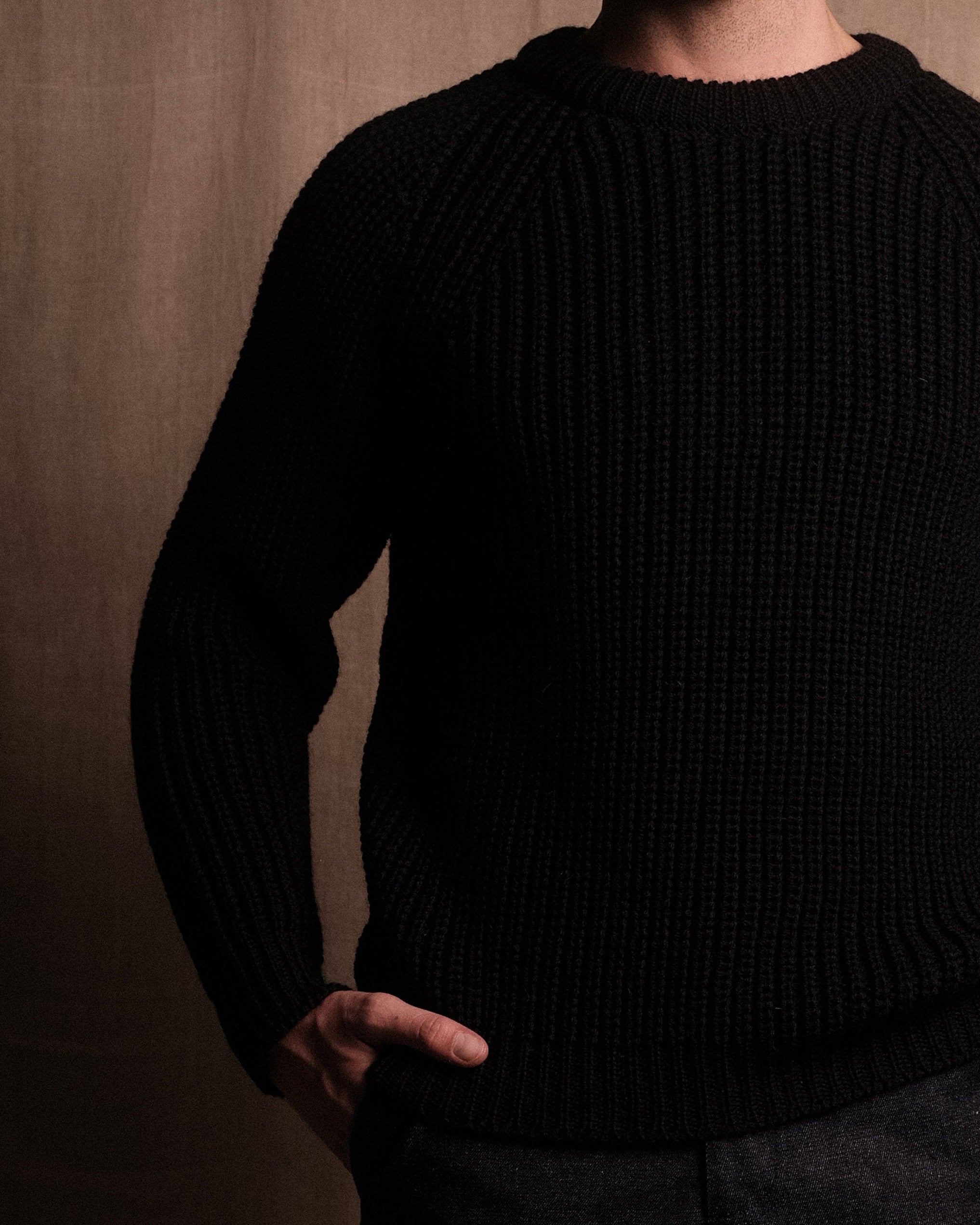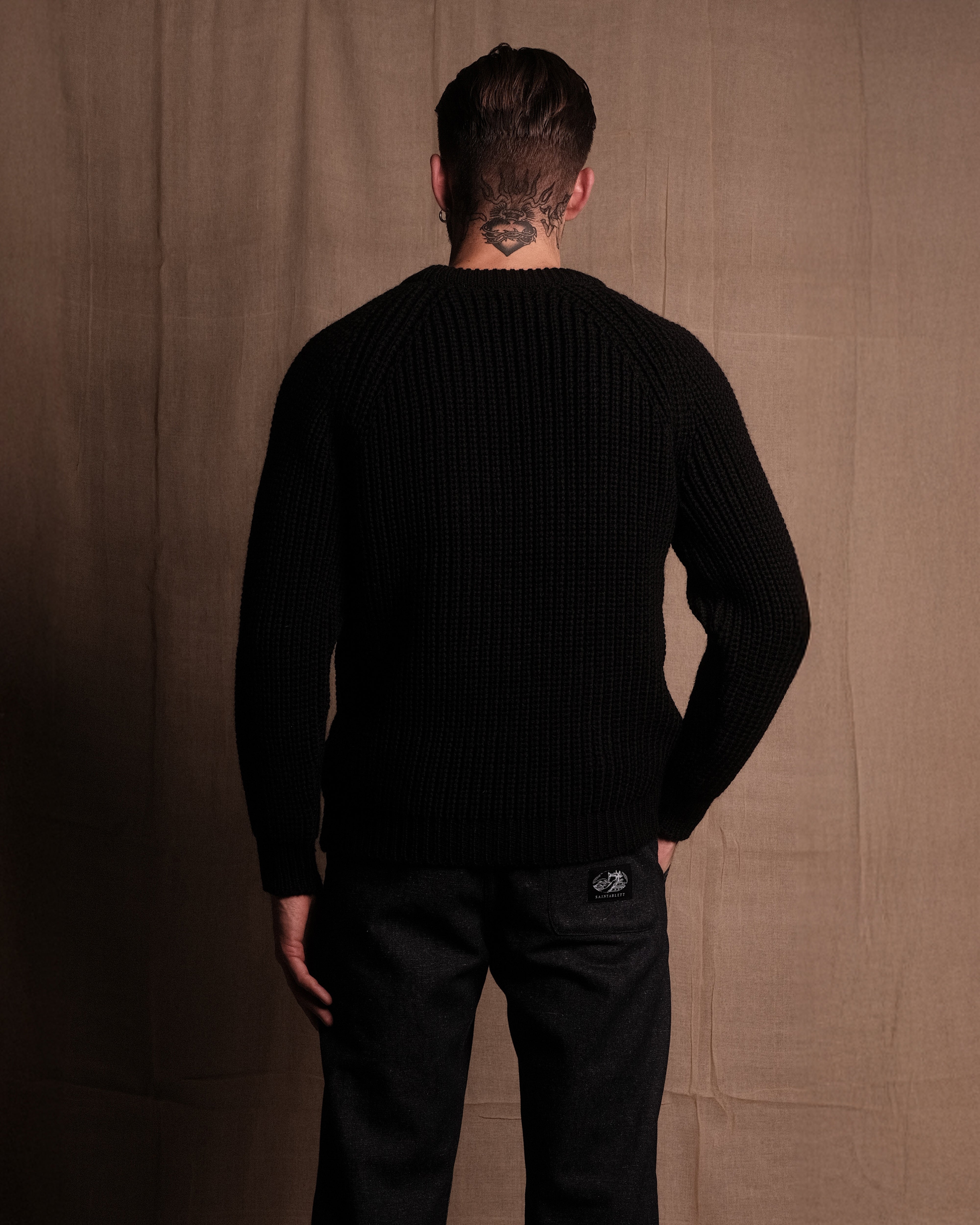 FISHERMAN KNIT 001 in Black - Our first knitwear piece. Crafted in Nottingham, England to our exacting standards in extremely small batches. Crafted from 100% British wool, we set out to create a traditional fisherman knit that embodied our ethos and standard. Minimal, warm and effortlessly wearable, with SAINTABLETT labelling to the inner collar. Pair with TROUSER 001 for a complete look. NOTE: This product is quite slim fitting, but the wool will relax with wear. Purchase your normal size for a slimmer fit, size up for an oversized fit.