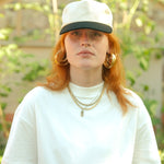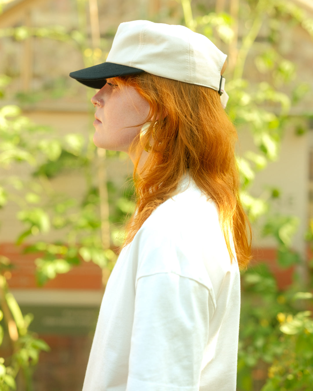 CAP 002 in Black / Ecru - Handmade in Manchester by Mike (The Long Shot Exp.) from offcuts of our Black Deadstock Japanese Denim, our Ecru Deadstock Italian Denim, and finished with a panel of British Indigo Denim internally to add structure. A 5 panel cap, unbranded externally, featuring selvedge detail strap-back, matt black buckle and Mike's trademark leatherboard peak. The peak is a softer and more sustainable alternative to plastic peaks, resulting in a more comfortable piece. Features The Long Shot Exp. & SAINTABLETT branding internally. Follow Mike HERE