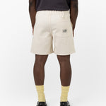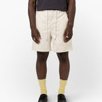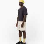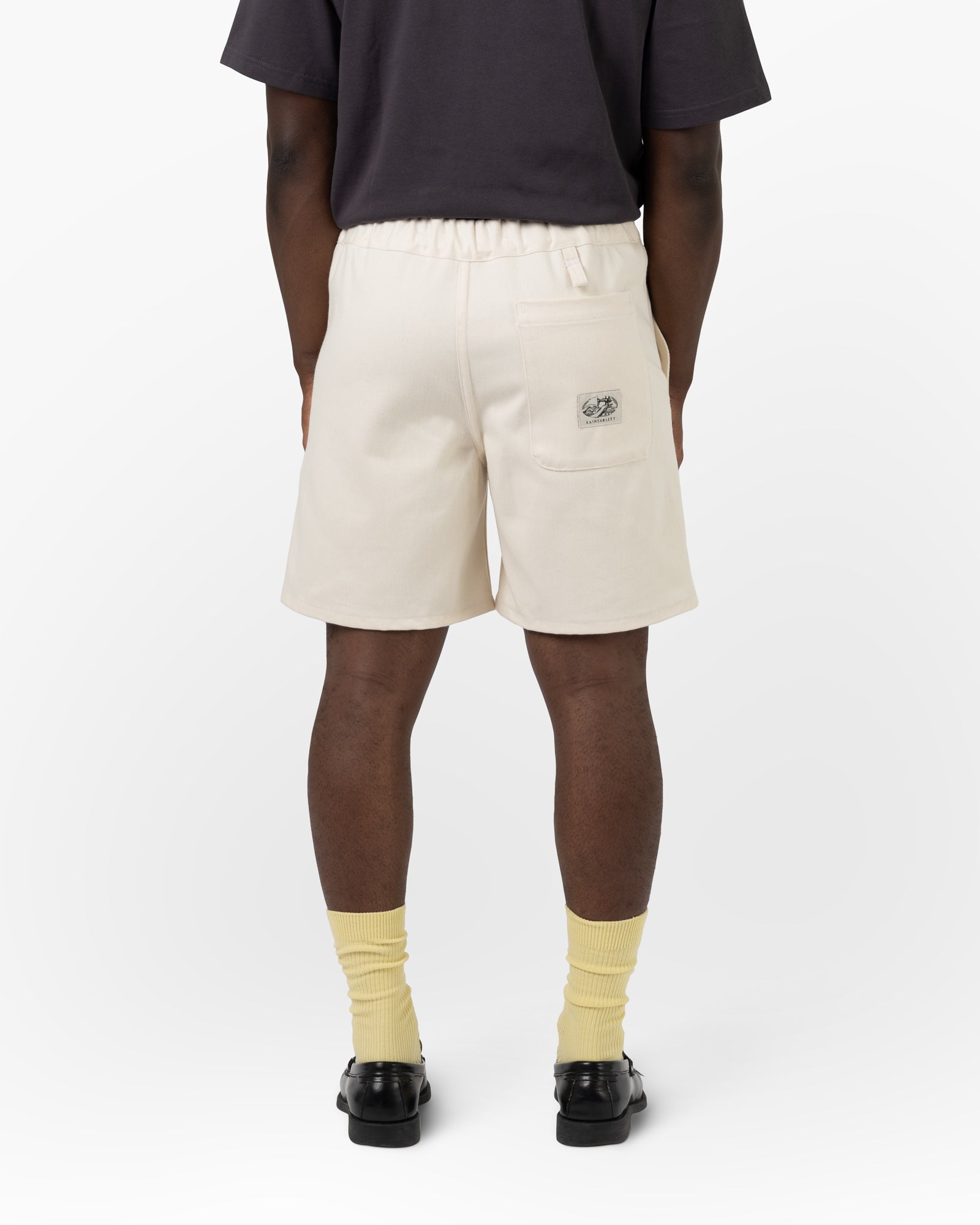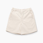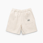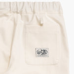 SHORT 001 in Ecru - A twist on our classic TROUSER 001 for the warmer months. Crafted by hand in our Norwich Atelier to our exacting standards. 11oz Italian Deadstock Selvedge Denim. 98% cotton with 2% elastane for maximum comfort, soft handfeel and exceptional drape. An off-white / ecru tone with very subtle neps throughout. Wide leg for a timeless fit, with concealed drawstring waistband. Featuring single back pocket, woven SAINTABLETT labelling, tonal topstitch, YKK zipper and key loop.