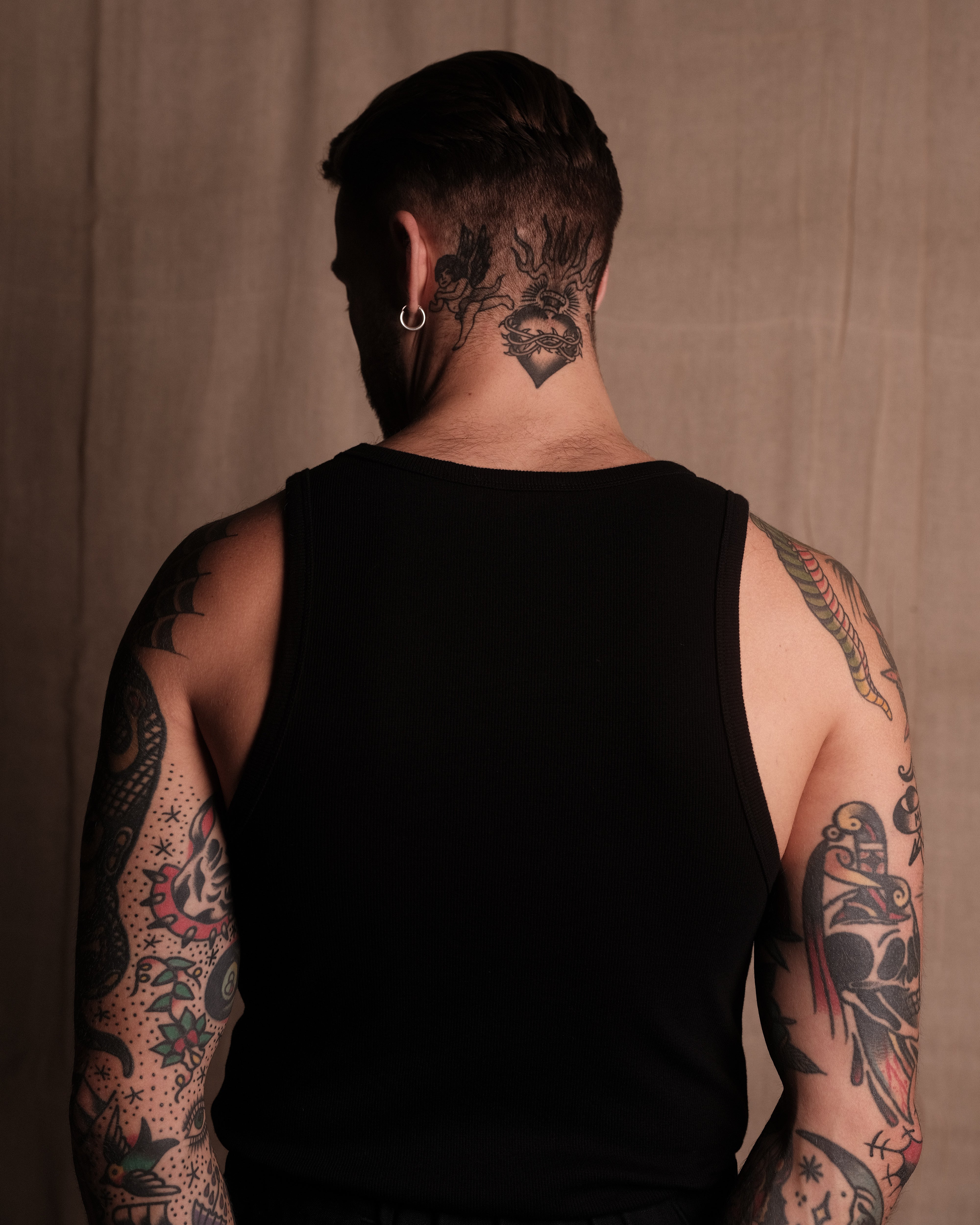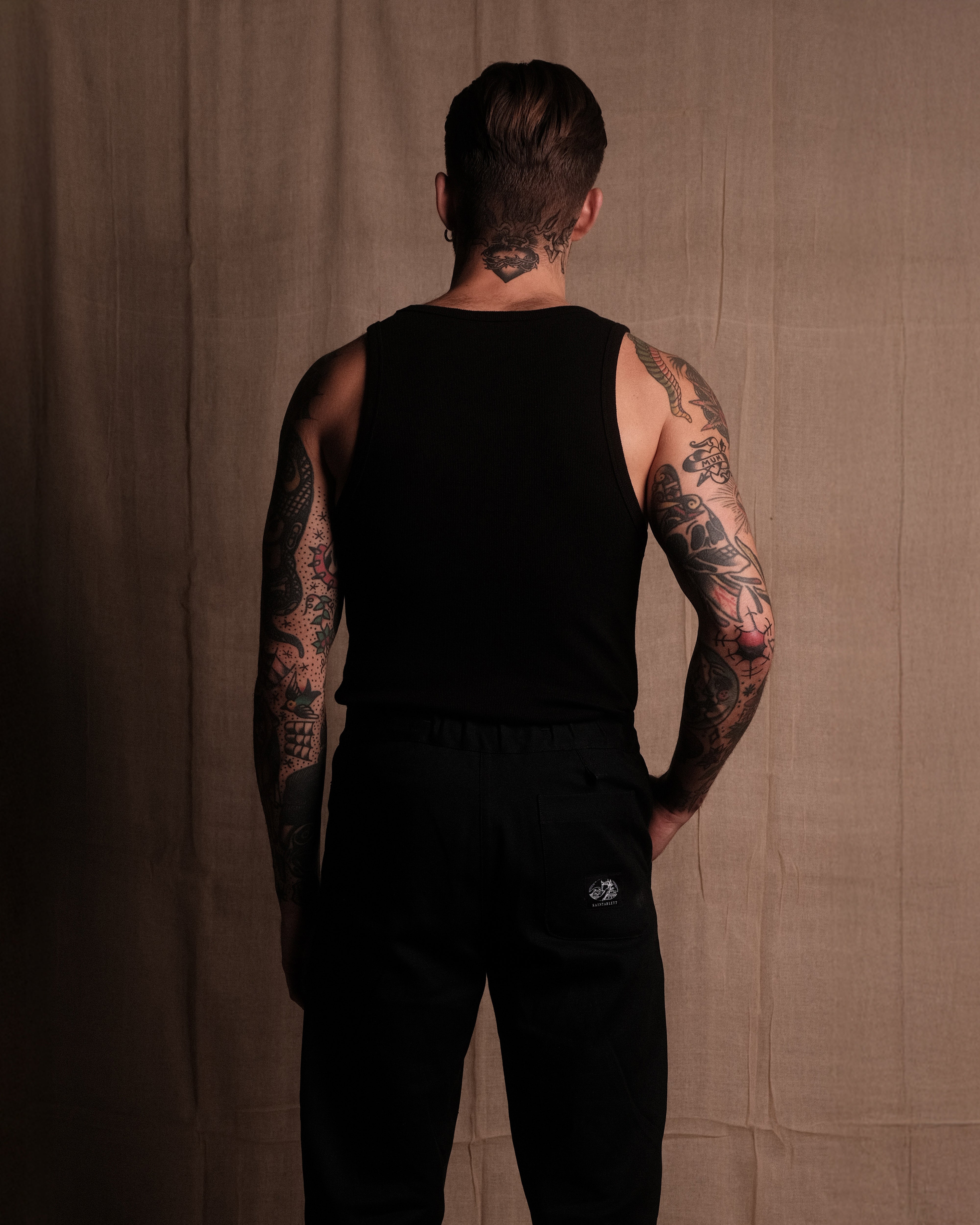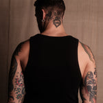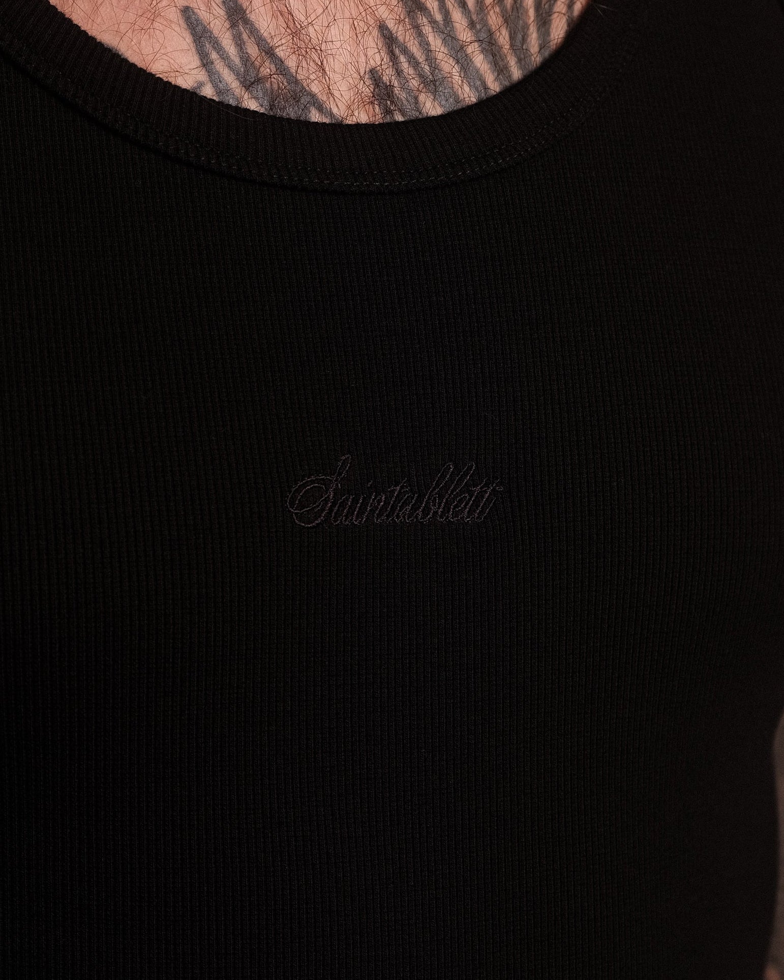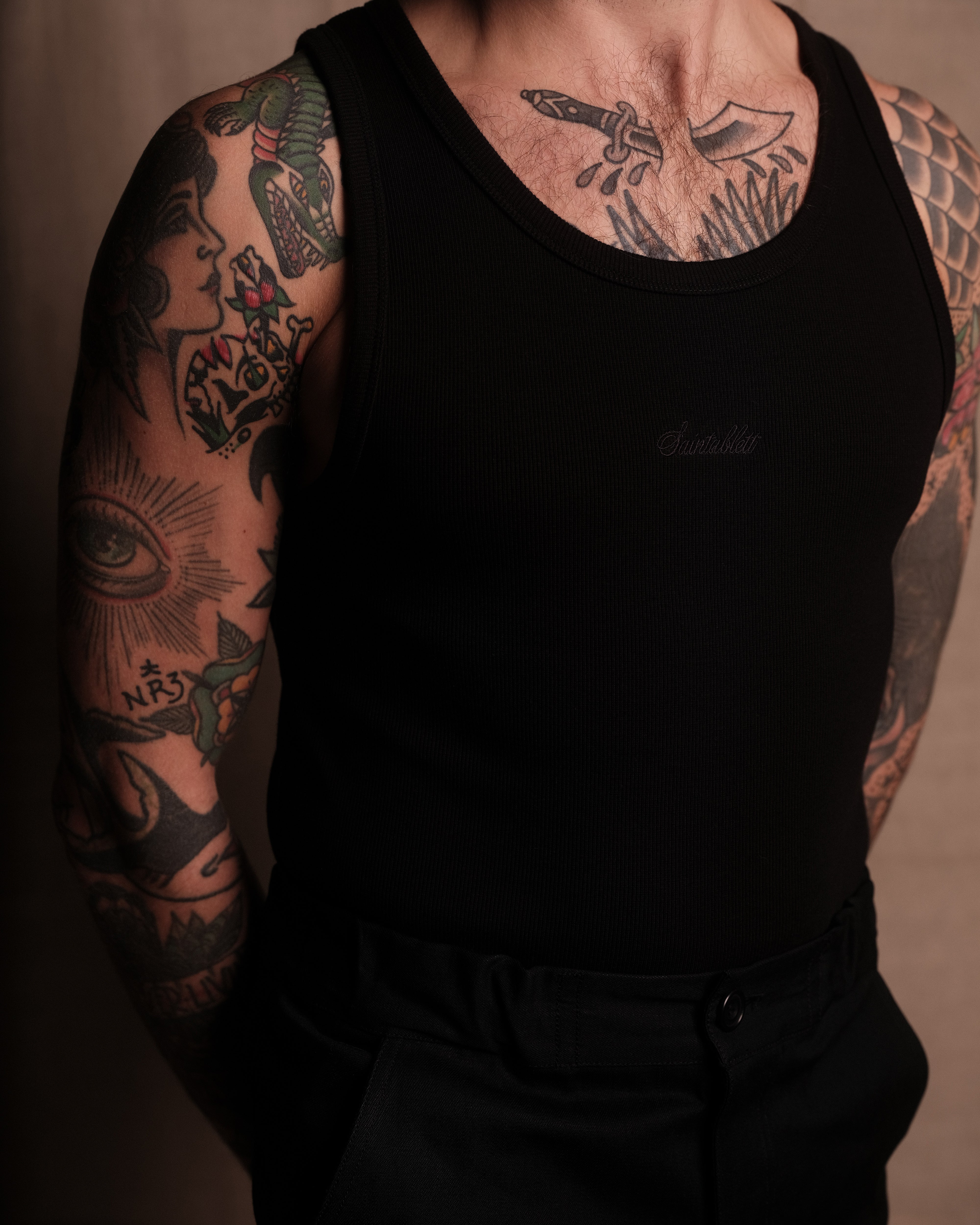 TANK 001 in Black - A new staple SAINTABLETT offering. Crafted in Portugal to our exacting standards. 350gsm jersey knitted from 95% cotton with 5% Elastane for comfort and stretch, heavyweight with a soft handle. Featuring SAINTABLETT script embroidered to the chest in subtle tonal thread. Fitted to the body and ideal for layering, with SAINTABLETT labelling to the inner collar. Pair with TROUSER 001 for a complete look.