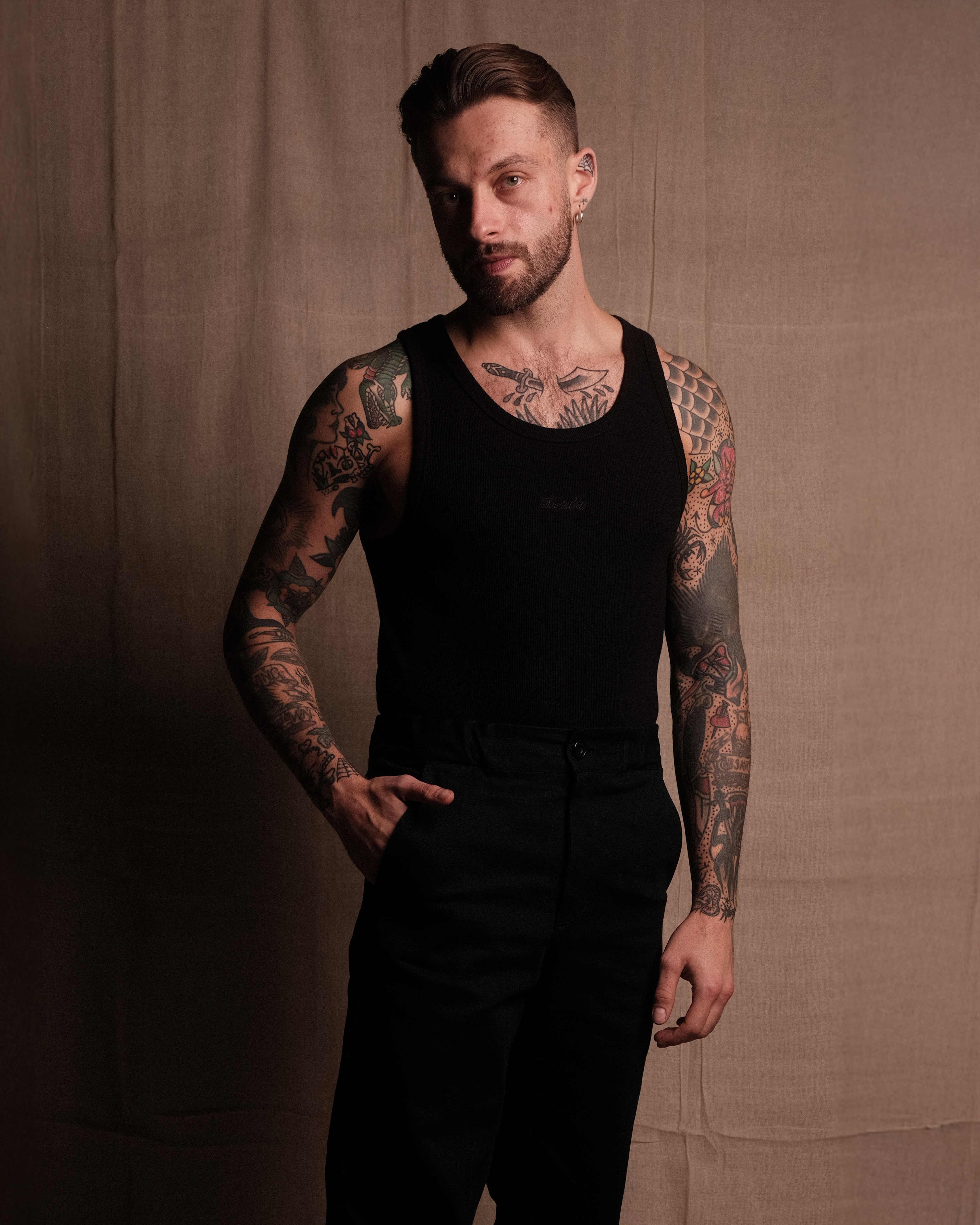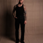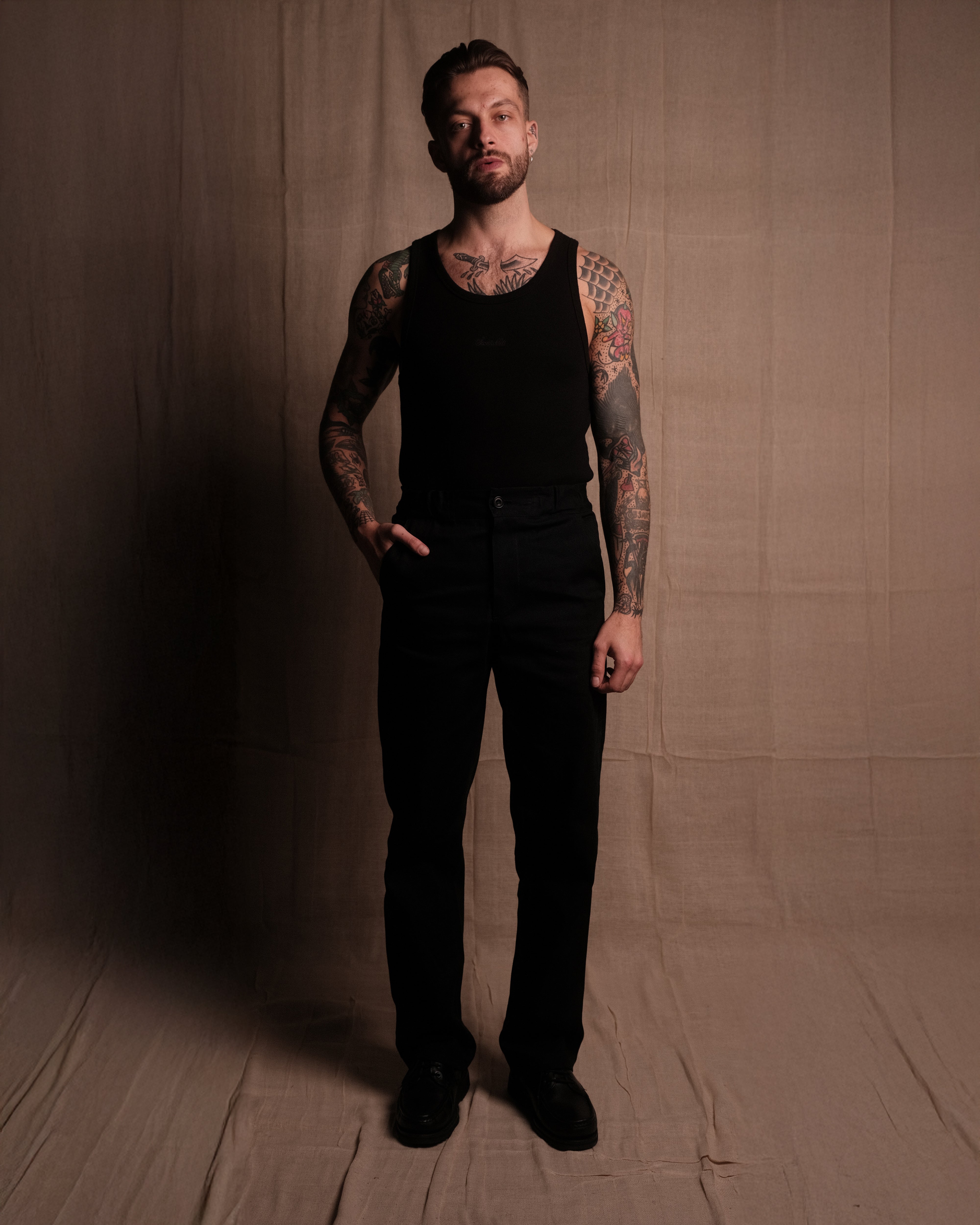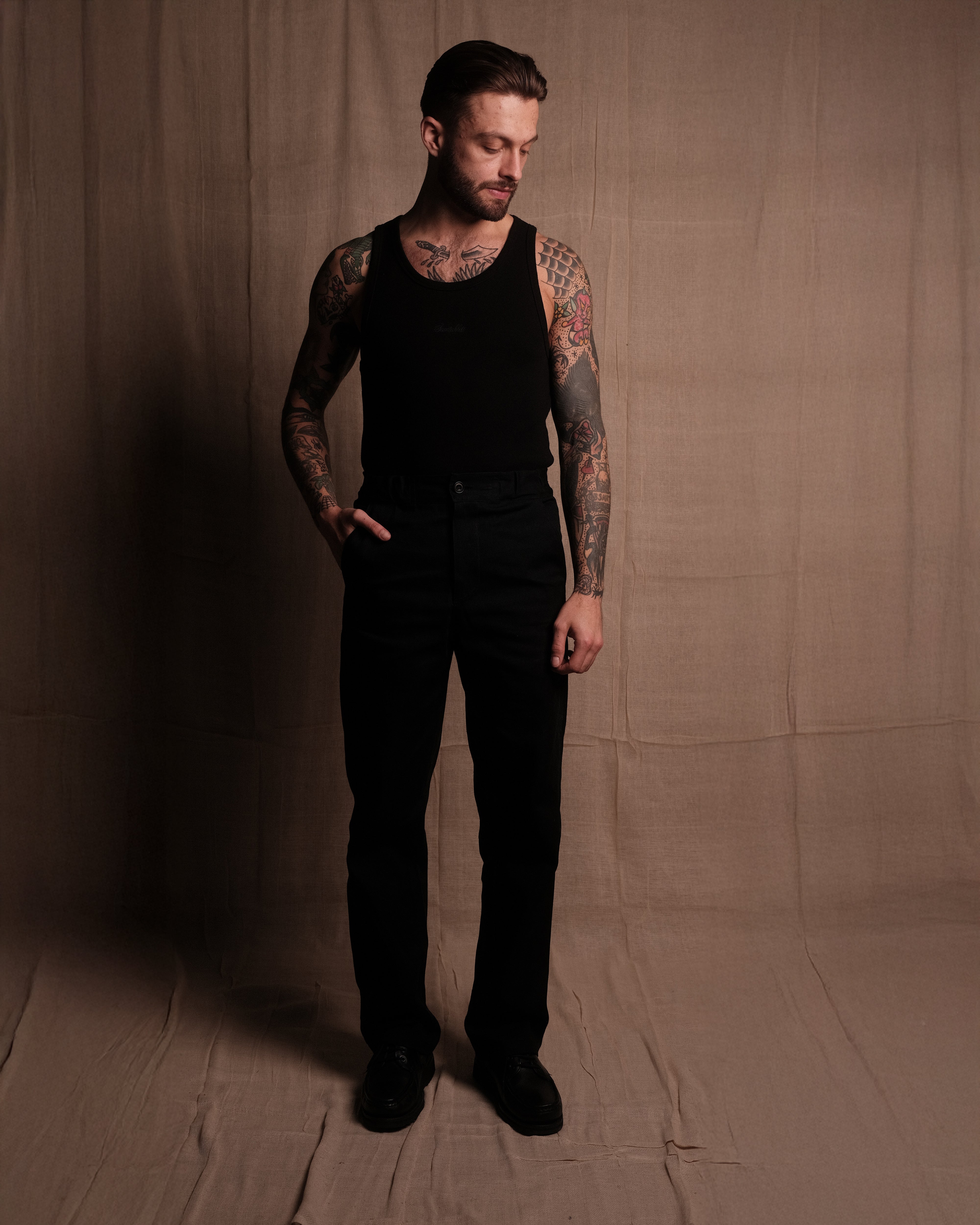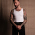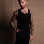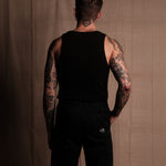 TANK 001 in Black - A new staple SAINTABLETT offering. Crafted in Portugal to our exacting standards. 350gsm jersey knitted from 95% cotton with 5% Elastane for comfort and stretch, heavyweight with a soft handle. Featuring SAINTABLETT script embroidered to the chest in subtle tonal thread. Fitted to the body and ideal for layering, with SAINTABLETT labelling to the inner collar. Pair with TROUSER 001 for a complete look.