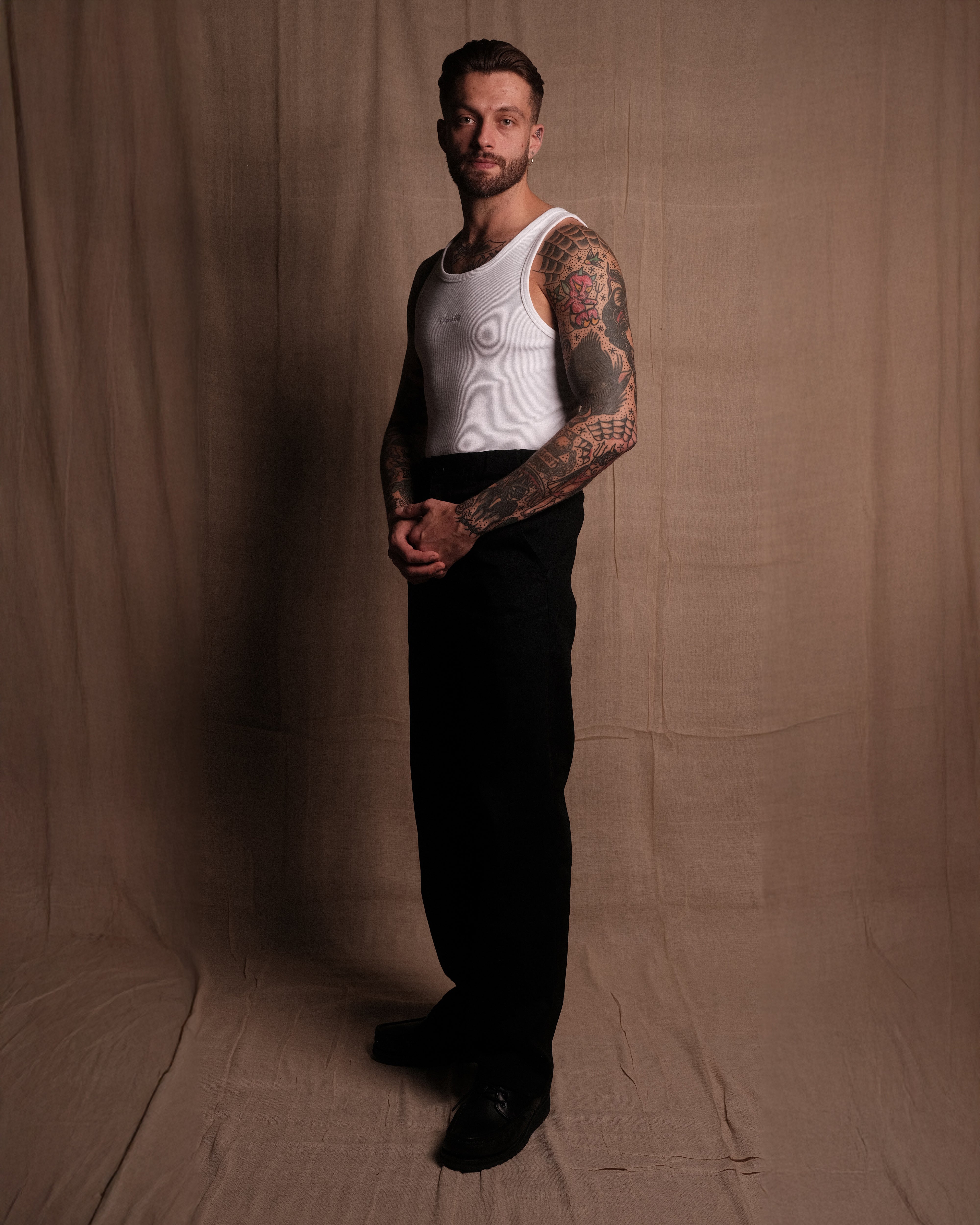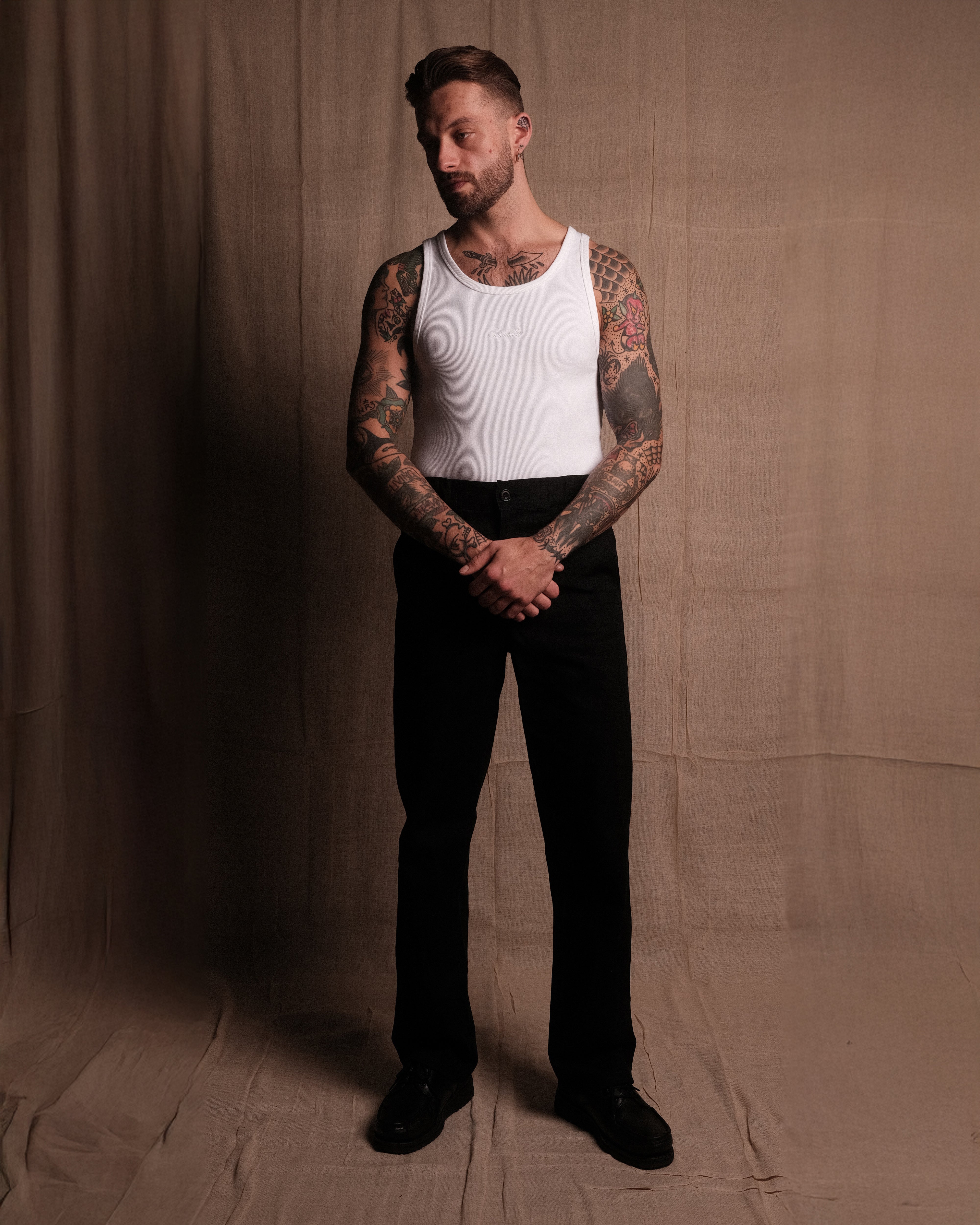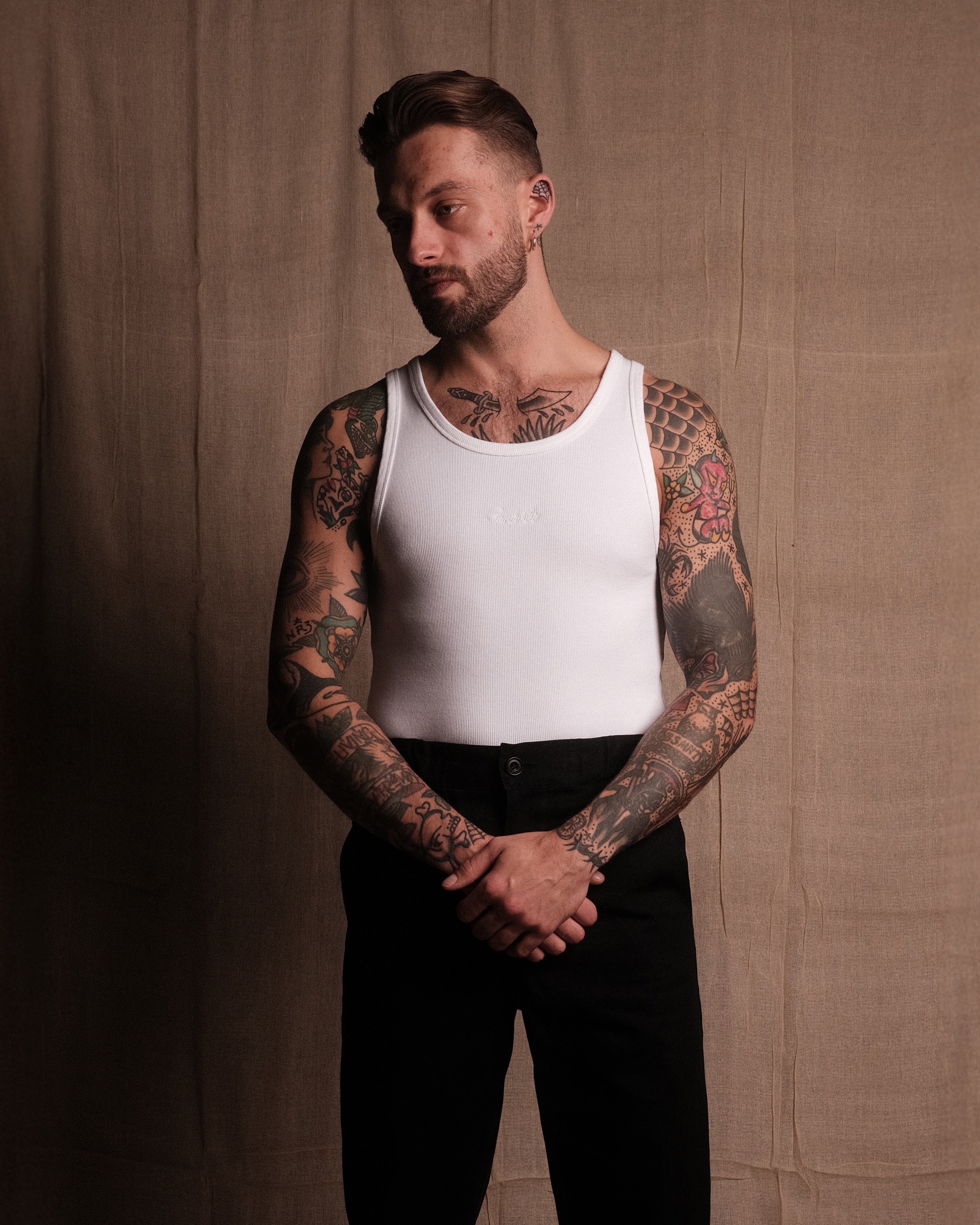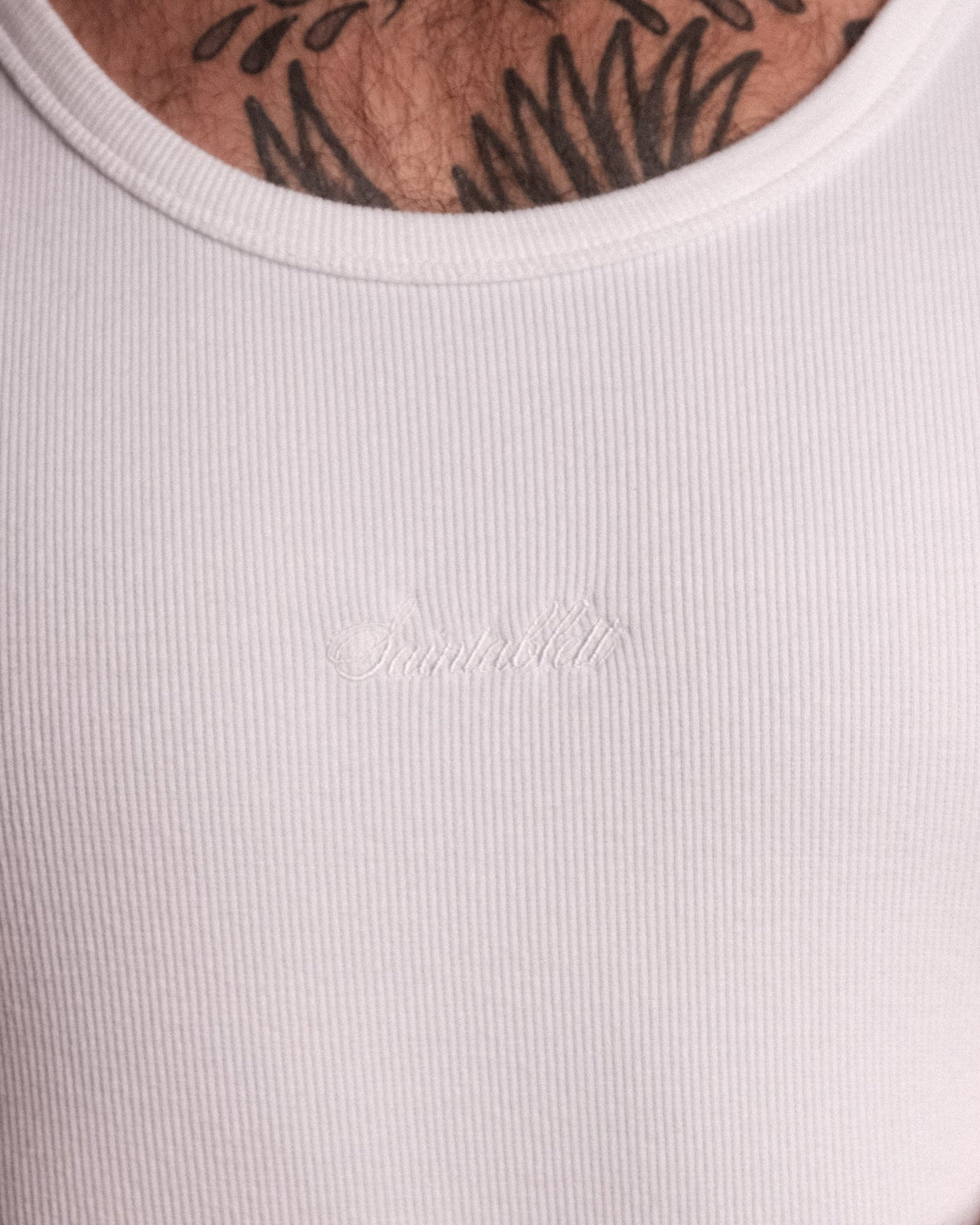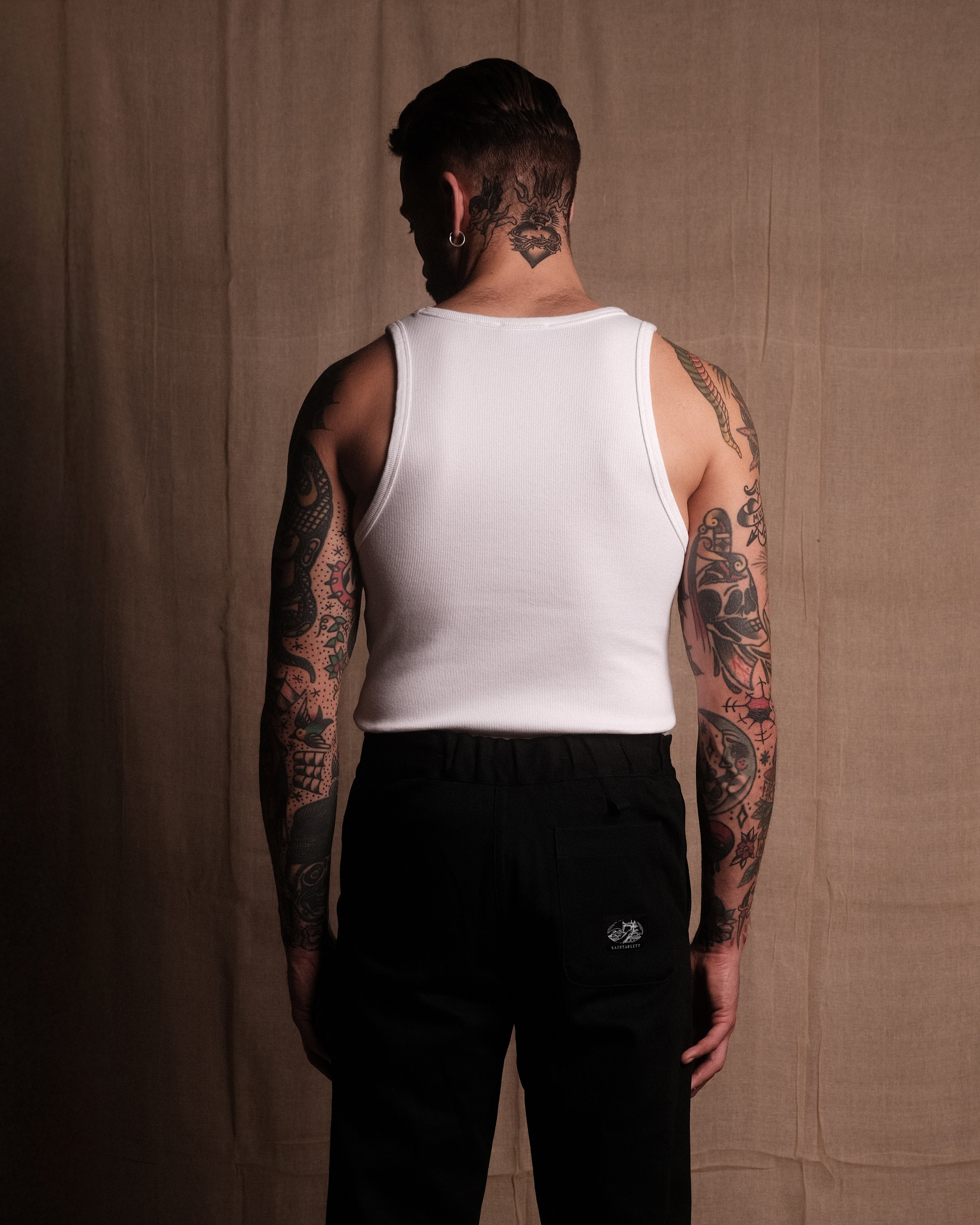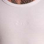 TANK 001 in White - A new staple SAINTABLETT offering. Crafted in Portugal to our exacting standards. 350gsm jersey knitted from 95% cotton with 5% Elastane for comfort and stretch, heavyweight with a soft handle. Featuring SAINTABLETT script embroidered to the chest in subtle tonal thread. Fitted to the body and ideal for layering, with SAINTABLETT labelling to the inner collar. Pair with TROUSER 001 for a complete look.